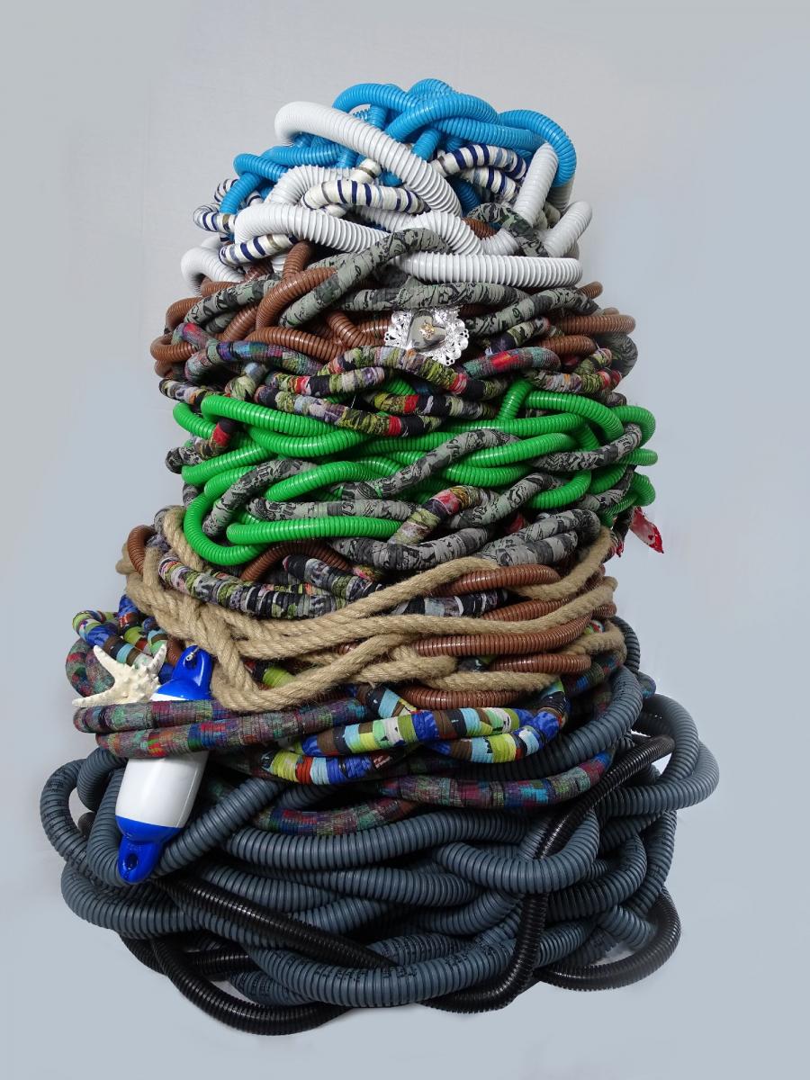 L’intricato groviglio di tubi rappresenta gli elementi di stratificazione della città costituita dalla Napoli sotterranea, dai quartieri marinari adiacenti ai pontili ed agli attracchi nautici, dai quartieri collinari a ridosso di ville e giardini, dal caos metropolitano, tutto quanto sotto un cielo azzurro velato da nuvole. Gli oggetti sono i simboli di una città di mare, d’arte, intrisa di religiosità popolare, ma anche di sanguinaria violenza. Tutti questi elementi convivono in una città la cui complessità non trova soluzione.